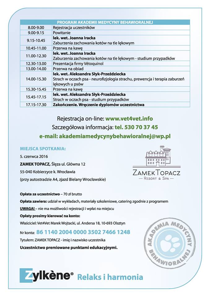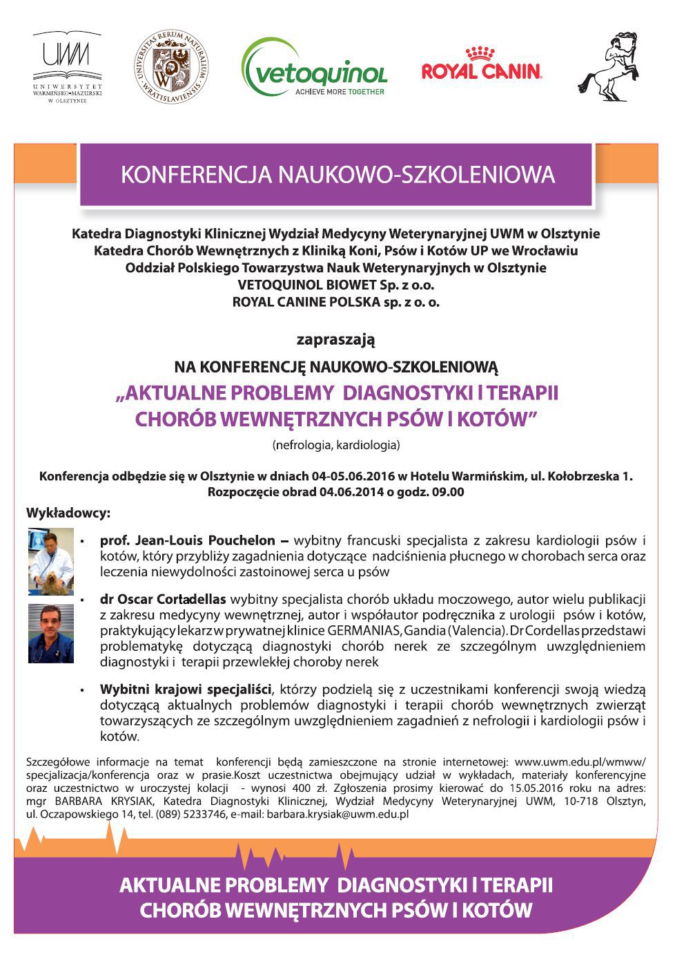 Zapraszamy do udziału w Konferencji Weterynaryjnej "AKTUALNE PROBLEMY DIAGNOSTYKI I TERAPII CHORÓB WEWNĘTRZNYCH PSÓW I KOTÓW", która odbędzie się w Olsztynie w dniach 04-05.06.2016 r.