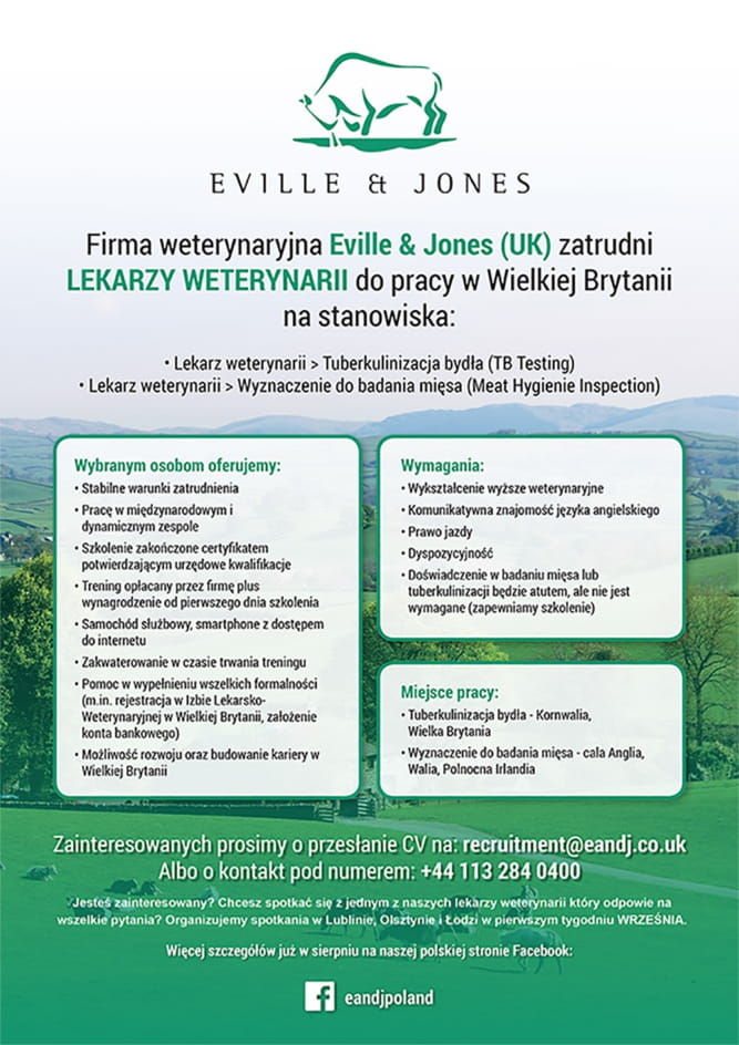 Praktyka weterynaryjna Eville & Jones (UK) zatrudni lekarzy weterynarii gotowych podjąć pracę w Wielkiej Brytanii na stanowiskach: